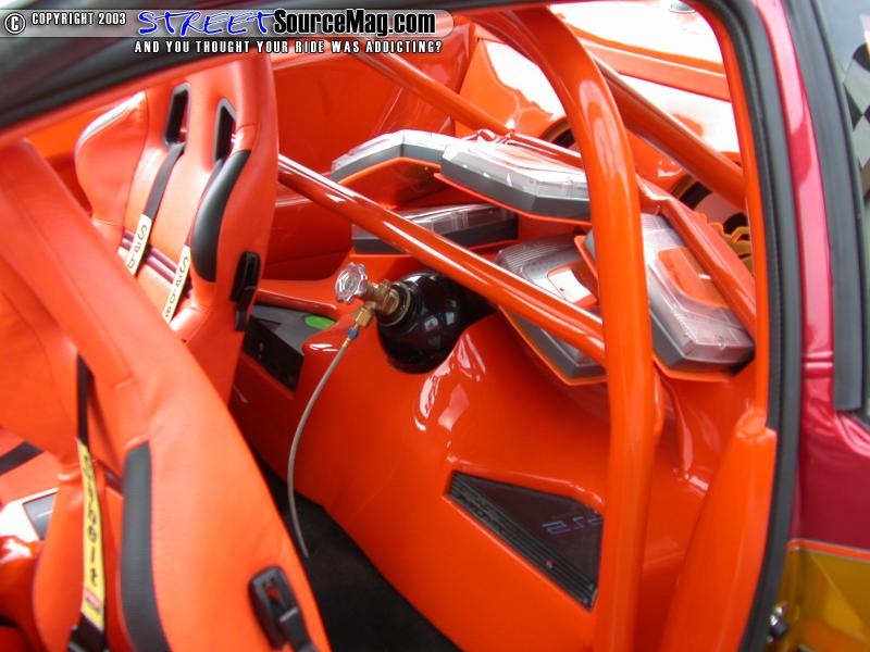 Sparco seats along with Racing harnesses would then be installed along with a custom-built roll cage for added safety. RK Sport custom Cavalier engraved door sills would be installed, while a custom center arm rest by M&B Enterprises would finish things off.