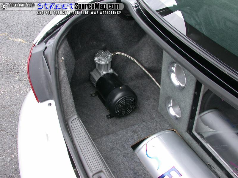 The suspension received love with a full air ride set up. The rear was fitted with truck bags installed with a set of custom brackets. The front got use of air struts from airbagit.com. The system includes ½ inch air line, a ¾ HP compressor, 5 gallon tank and 10 switches (which he says was very confusing to wire correctly).