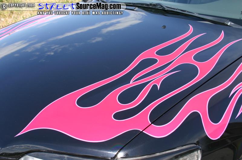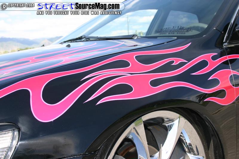 The exterior of the car has a shaved trunk lid, and HOK Pink graphics pin stripped in purple over top of the black paint. The car also has a set of projector headlights and eyelids painted to match.