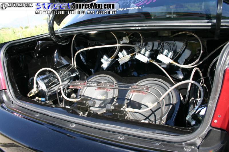 The car rolls on a set of 19” Chrome wheels wrapped in low profile tires, and man are those things shiny! It was also fitted with air ride, and raises and drops courtesy of EAI air valves.  The interior has some painted pieces, and the trunk has a custom-built fiberglass enclosure built by Dirty housing 2 Phoenix Gold subs, which appear to be 12’s.