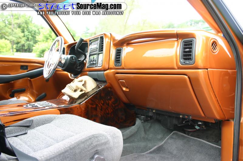The interior features a painted dash, and painted door panels. The center console was smoothed and painted and the seats were swapped out for a set out of a 1997 S-10. Custom SS vents by CMC Metals were installed in the dash, along with a Trenz Billet mirror, and a Colorado Customs Steering wheel. The dash also houses the Pioneer CD player. Tom’s stereo consists of JL Components, a JL 10” sub, and JL Amp.