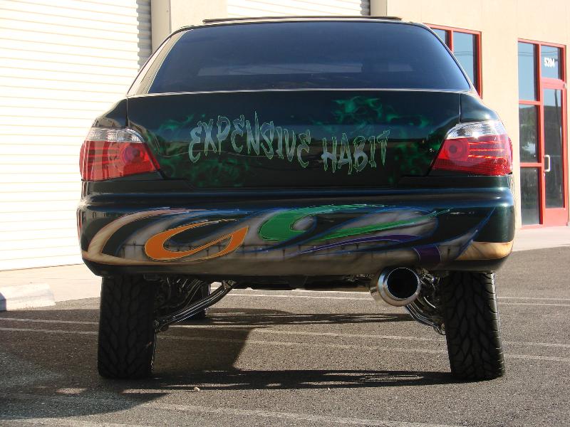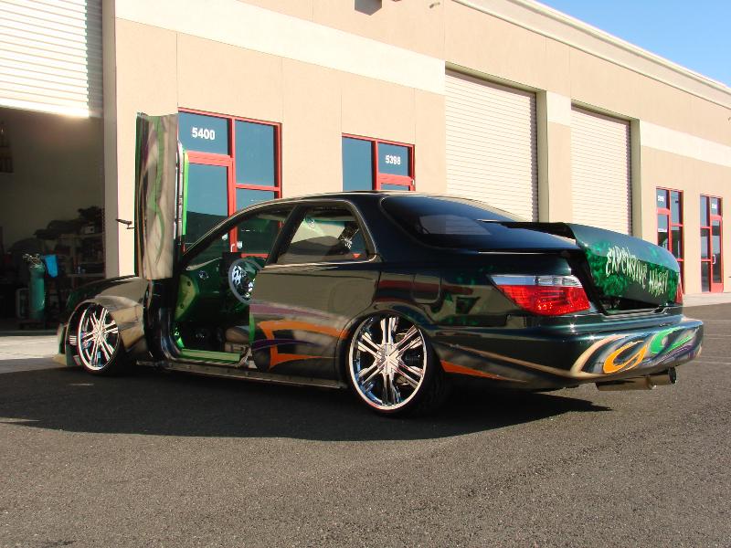 front end infiniti i30 headlight swap, bmw 5 series back end swap, motorized suicide hood and trunk, lambo front doors, and suicide lambo rear doors, shaved handles and moldings, custom made front bumper, custom cut billet grills. 35x40 street beat ragtop. redoing some shit.