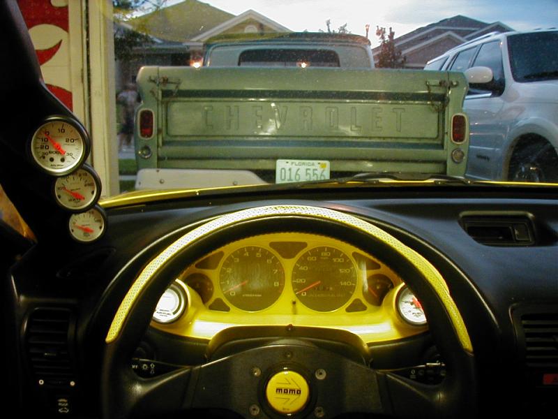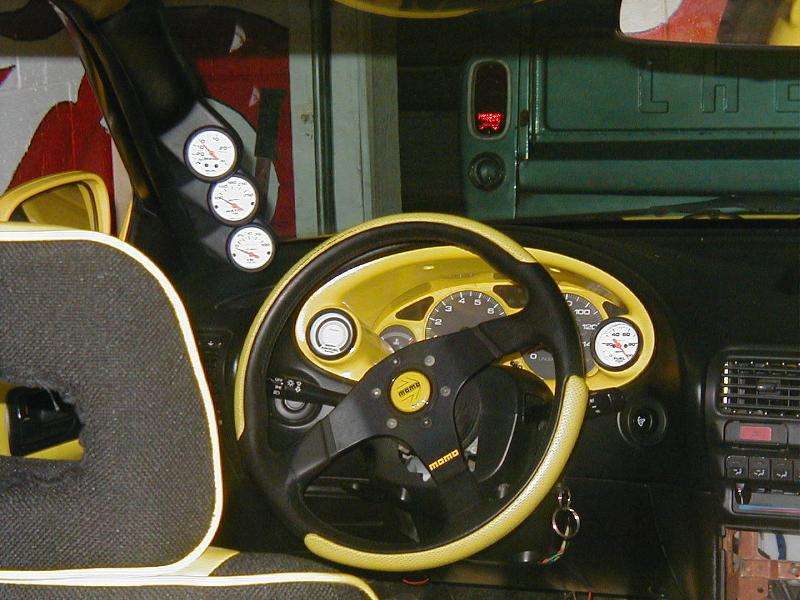yellow leather w/black tweed throughout. auto meter guages.hks evc. and hks turbo timer.