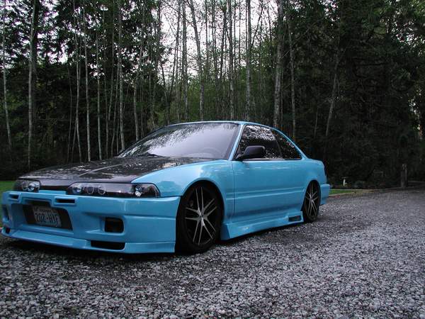 shaved side moldings, Shaved antenna, shaved window squiters, emblems, trunk key hole and door handles, carbon fiber hood and 1pc black housing projector headlights new custom blue paint job, R33 Skyline front, Urethane black widow sides and rear