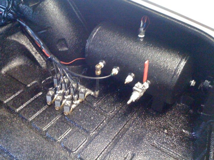 Slam'r 6's up front, Dominator 7's out back over the axle. 4" pipe c-notch. 5 gallon tank, Viair 400, Rockstar 1/4" valves, AVS gauges