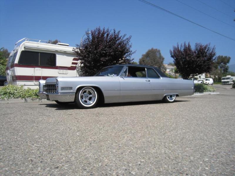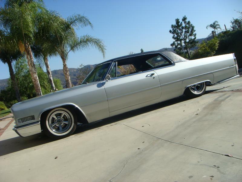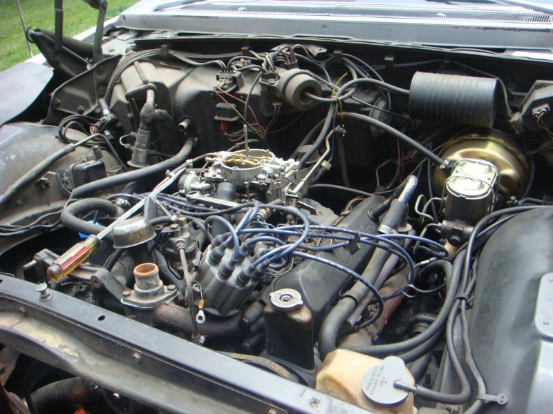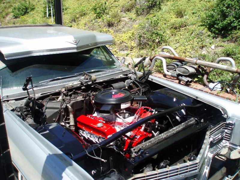 500 cubic inch Cadillac from a '70 Eldorado. 2" dual exhaust with bellflower tips