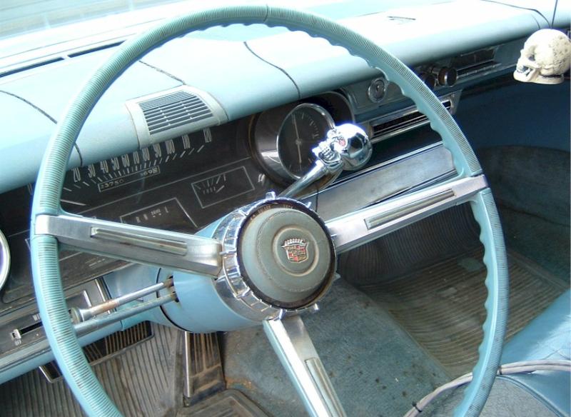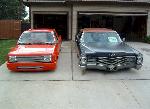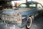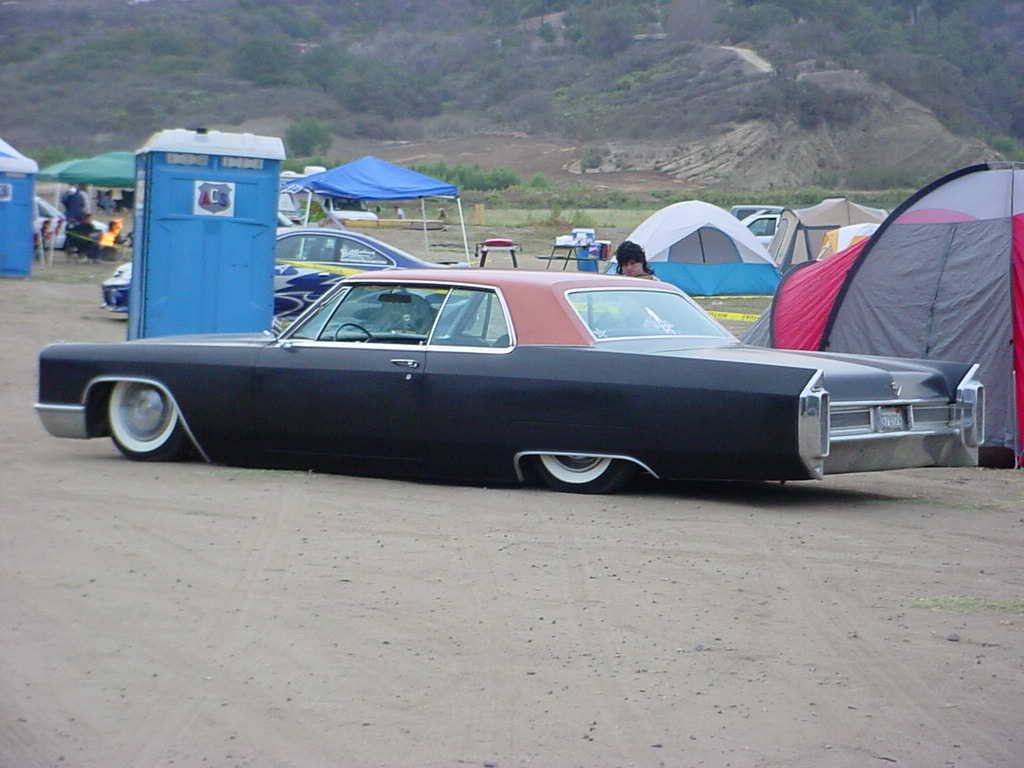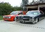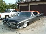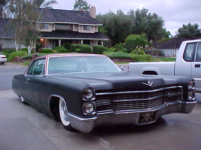satin black using 99k shot by max at bio kustumz and me...well i just stood there and watched but i helped sand the big thing. the roof is painted some type of dodge orange wich had a lot of metallic then we shot some orange glitter over that and two coats of clear. REALLY SPARKLY. shaved corners, side chrome, antenna. It also sports the back of a sixty five caddy including the trunk, bumper and tailights..(NOT A BOLT ON) Bio Kustumz really had to do some modifying for it too fit.