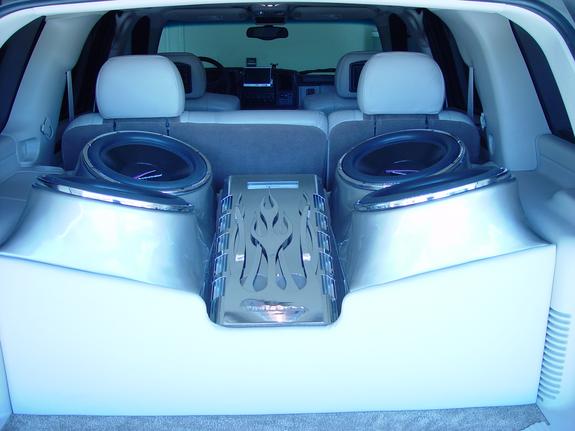 Audiobahn High Excursion 15's Four of them, being pushed by 2 Audiobahn High Current Amps and their pushing 2400 watts a piece. The box was custom built in about a week to build out of fiberglass. cd changer in console. 3 tv's