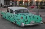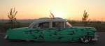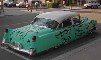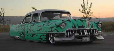 primer green body, white primer top, black primed flames. nosed, decked, shaved antenna and hood ornament as well as emblems and caddy insignias, nose pointed, hoodline removed, taken down to steel fully, all rust repaired.