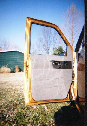 unfinished, but has tweed on the dash and front door panels with flames, billet specialties steering wheel to match wheels, rhino lined from the front seats back from floor to roof for stereo, and just added 2003 Toyota Sienna leather buckets, that I robbed for 30 BUCKS!?