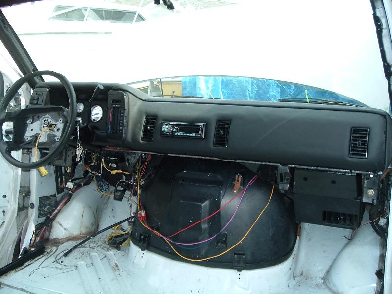 autometer american platinum gauges with the black bezels, custom shaved dash wrapped in plush fake leather, leather power seats out of something, custom door panels, everything custom wrapped