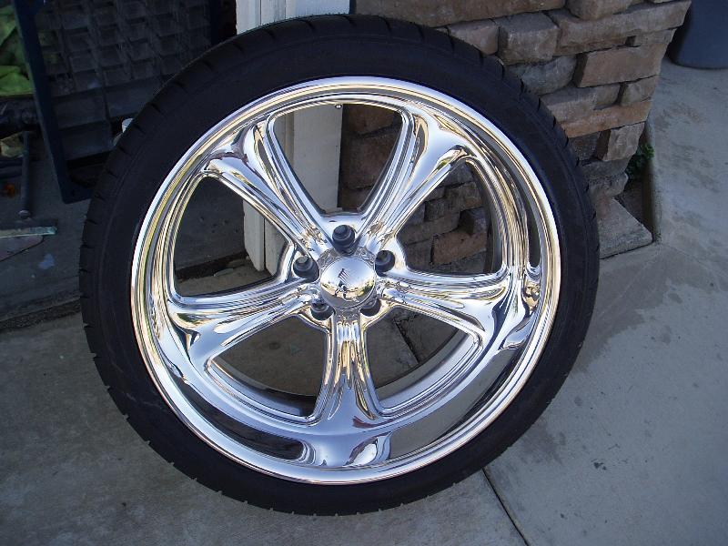 18x7 front 20x8.5 rear, Nitto tires. Red "steelies" for mock up