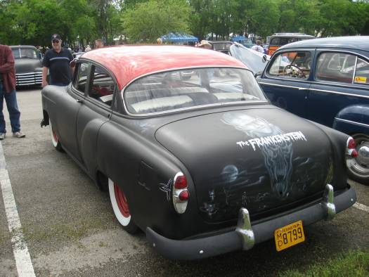 Flat black body with custom pinstripes by Howard Zeller, Air Brush on trunk by Terrel Ellington both out of SoCal. Roof painted Firecracker Red with House of Color Orange Frost Pearl.
