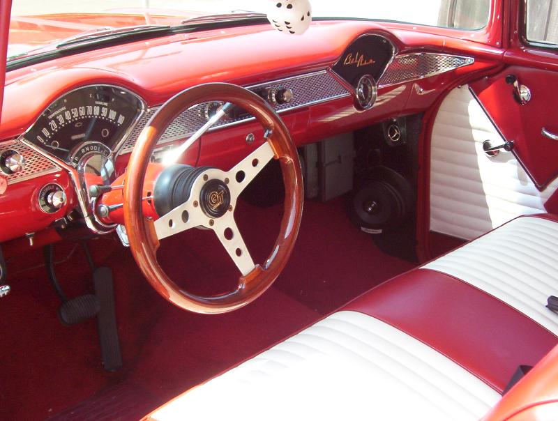 Red Carpet, Two tone red/white tuck & roll. Vintage Air, Tilt Column, CD Player. Not to crazy, just super clean.