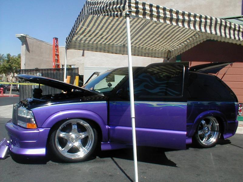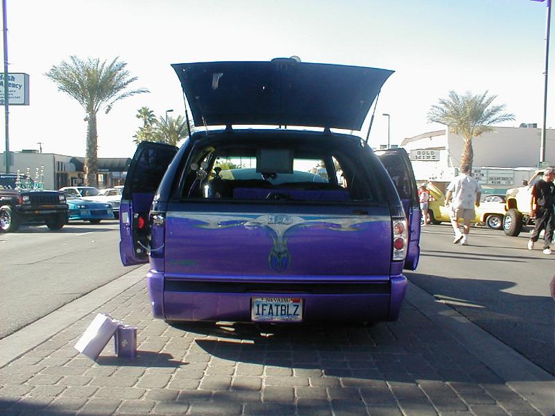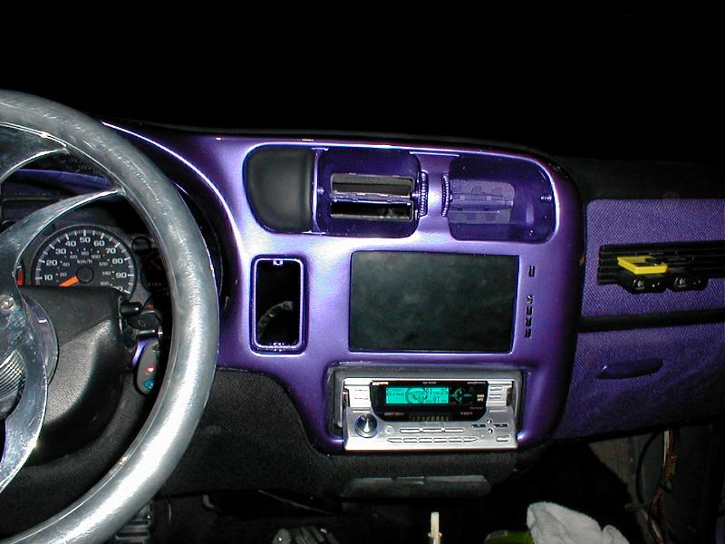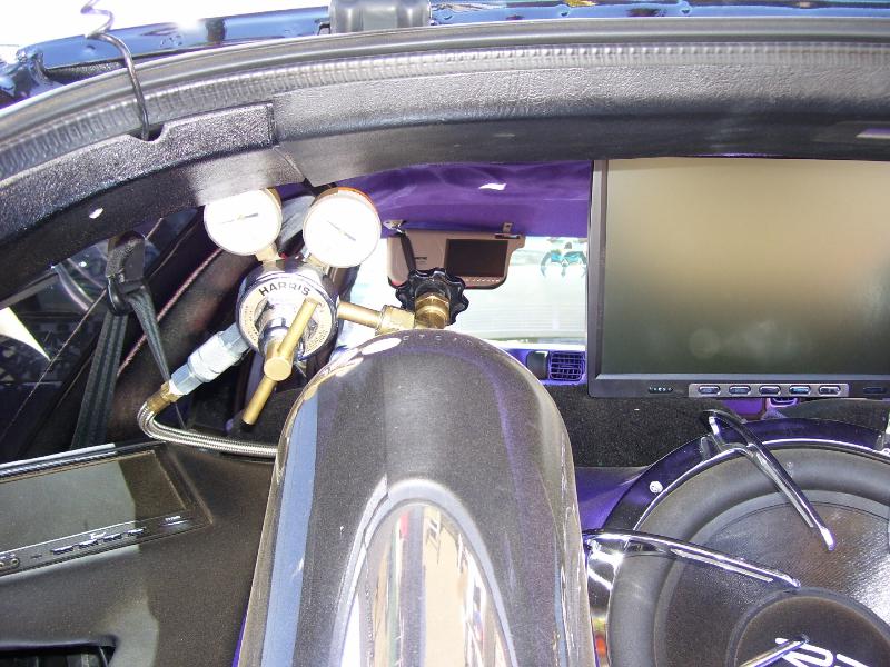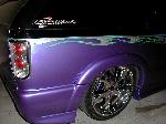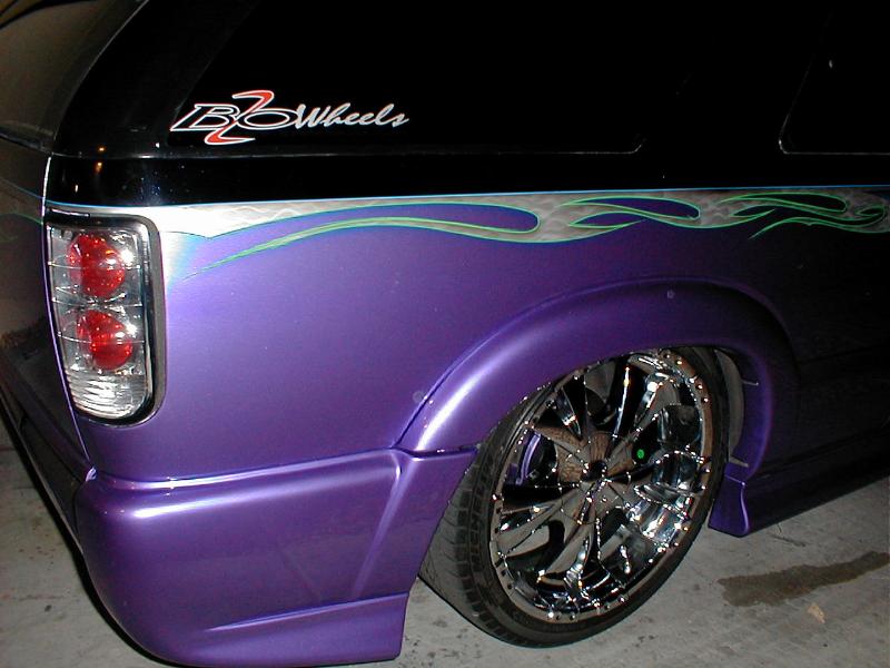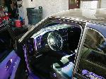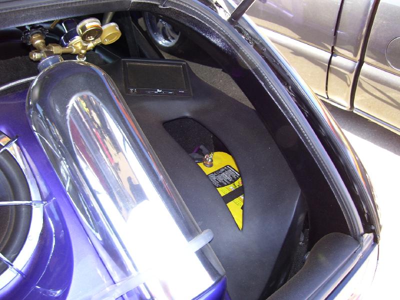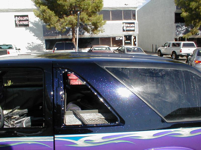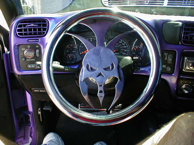 Billet Steering wheel form Kustom Kreationz, polished bezel, stainless gauges, polished flamed pedals ... Complete interior Black vynal and leather and violet tweed, fiberglass shaved doors skins, Molded facia tv, floor, seats with flames, shaved dash, head linner, everything even seat belts.., nobs, center council, extinguishers, Custom fiber glass enclosure. Painted 8 gallon expansion tank. Tailgate with amp molded in, 2-7 inch TV's in the rear, one 15.6 inch flip down, and 2 7 inch visor monitors with rear view mirror monitor. Tons of vibration control by FATMAT visit them at www.fatmat.com, way better than dynamat.