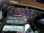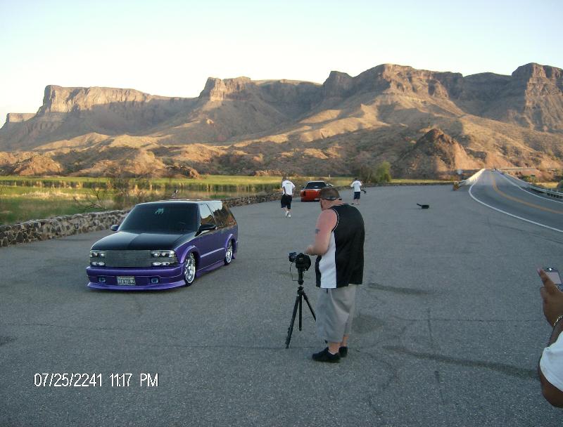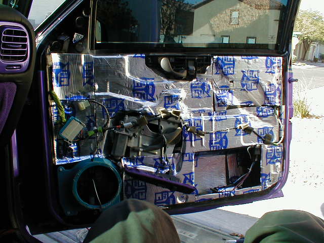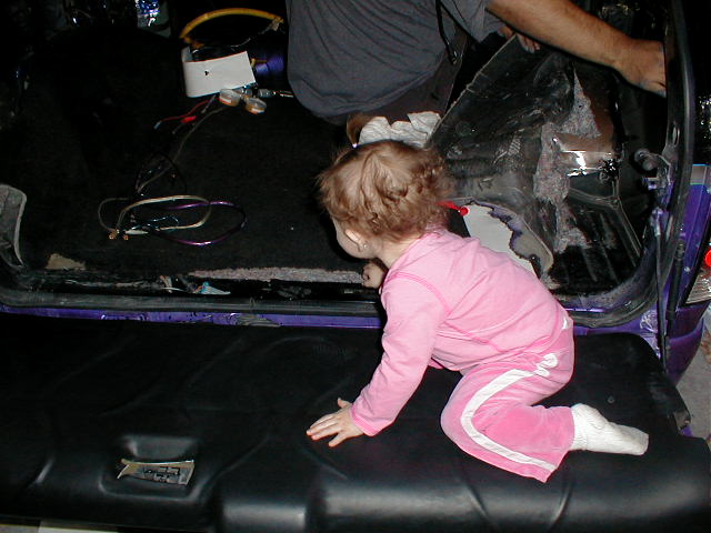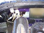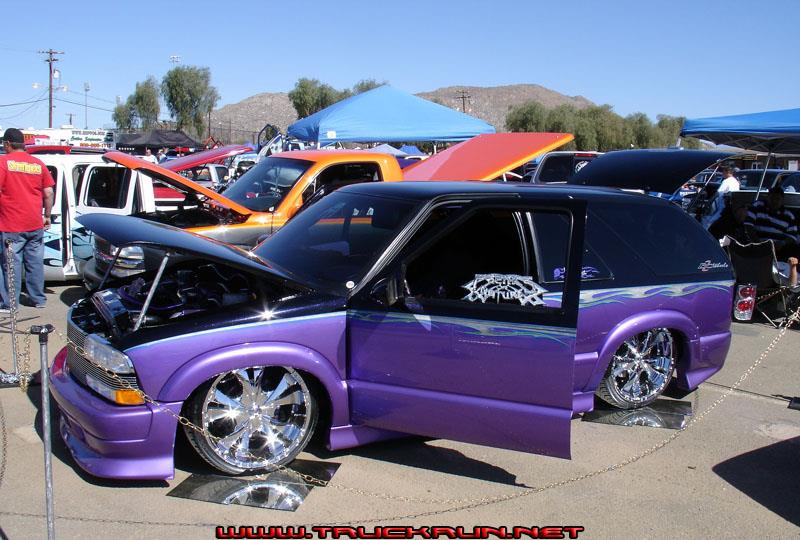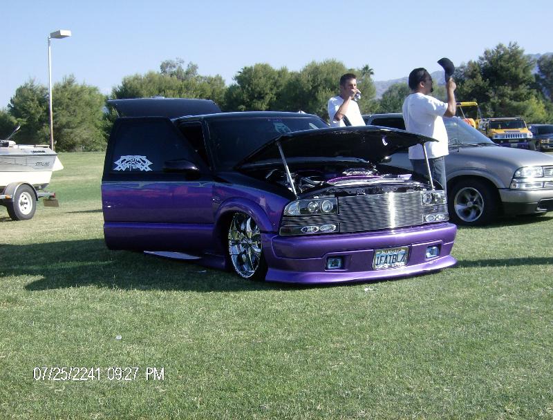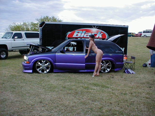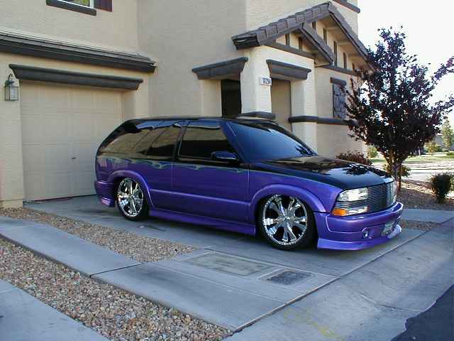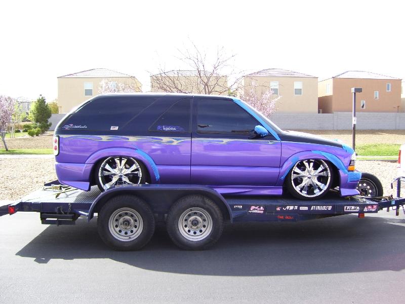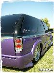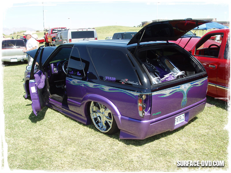 Billet Steering wheel form Kustom Kreationz, polished bezel, stainless gauges, polished flamed pedals ... Complete interior Black vynal and leather and violet tweed, fiberglass shaved doors skins, Molded facia tv, floor, seats with flames, shaved dash, head linner, everything even seat belts.., nobs, center council, extinguishers, Custom fiber glass enclosure. Painted 8 gallon expansion tank. Tailgate with amp molded in, 2-7 inch TV's in the rear, one 15.6 inch flip down, and 2 7 inch visor monitors with rear view mirror monitor. Tons of vibration control by FATMAT visit them at www.fatmat.com, way better than dynamat.