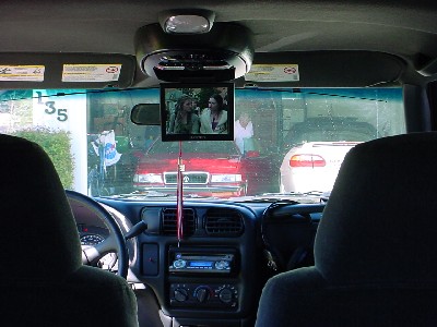 Customized dash console for stereo to create a more stock look. 6" Audiovox TV, VCR under back seats. Xbox mounted in back. Wireless headphones. Everything remote controlled.