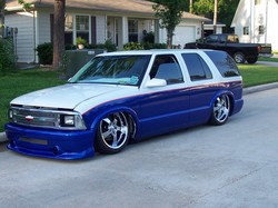 Slams 7" front, 6" rear, 2 link in the rear w/ panhard, custom built gas tank under cargo area, BYC upper and lower arms up front, 7" dual diaphram booster, a/c box modified (to damn hot in TX to have no a/c!!)