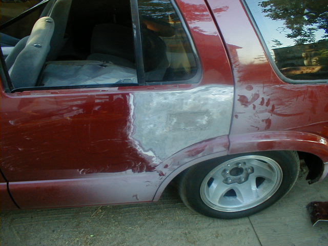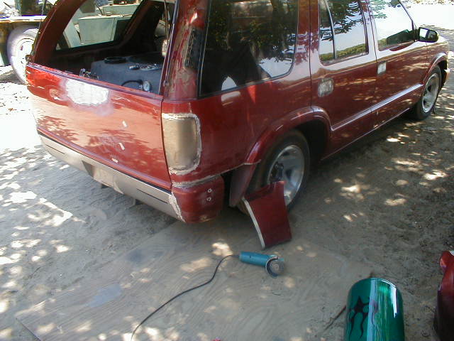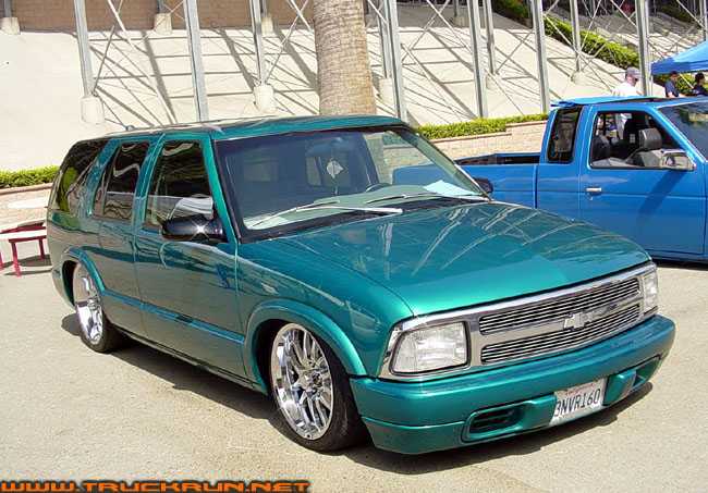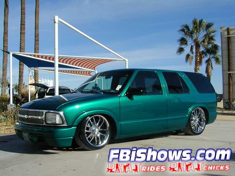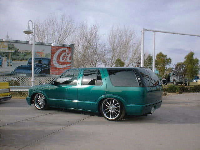 shaved door handles,antenna,hood squirters,gas door,tailights,rear wiper,rear lock,roof rack,(basically everything that wasn't needed)removed rear bumper and added an F.B.I. S-10 rollpan with LED tailights. Thanks to Central Valley Customs(559)287-6380 for the paint and bodywork.98 s-10 front bumper, billet grille,door poppers installed by Autotronix(now AVS), just installed 12 channel remote box to open doors and can control airbags with remote, and airhorn.