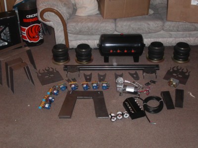 extreme air management kit #1 from suicidedoors.com, suicidedoors.com front bag cups, 2" belltech spindles. belltech 3" angled blocks in the rear with a leaf taken out and bumpstops cut
