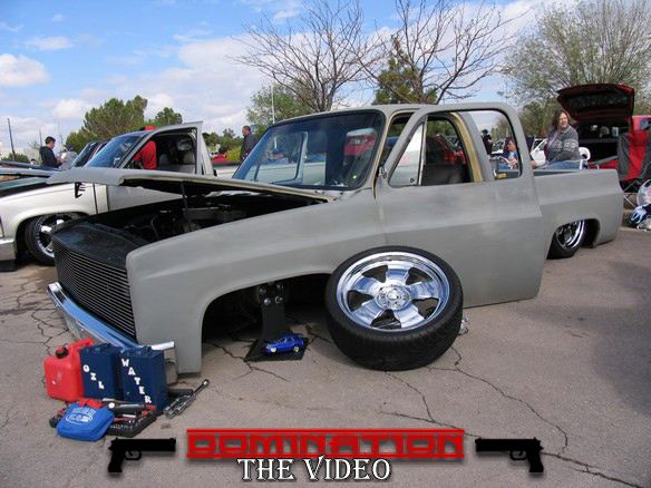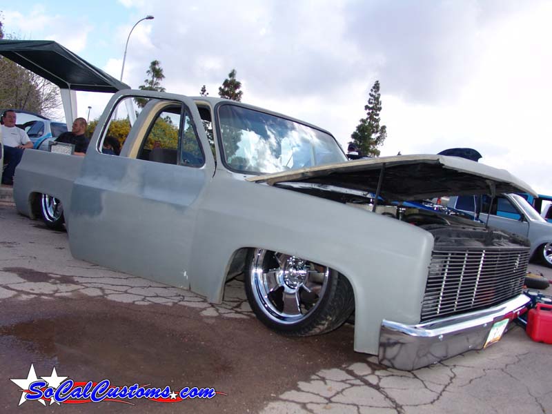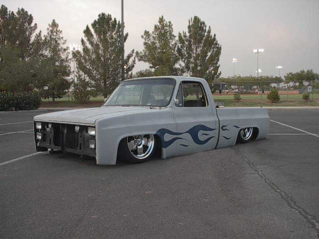 2600lb Firestone Bags, bodydropped the cab 6” and the bed floor 14”. A full custom four linked rear end on a cantilever system was also fabricated.