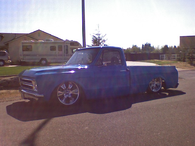 The suspension was done by several buddies of mine. They fabbed up a cantilever setup in the rear with the kp monster notches. i have two Vair comps, 1 6-gallon airtank, 8- 1/2" SMC valves, with a ten switch box. I also have 2 1/2 drop spindles. I have 2600 lbs bags all round.