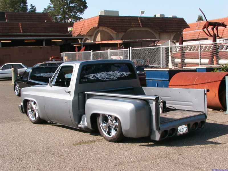Fresh DuPont Silver Metallic paintjob done by myself. Shaved emblems, mirrors, drip rails, cab molding, bed stake pockets. Corvette tailights, flamed motorcycle style mirrors, billet grille, and clear corners