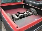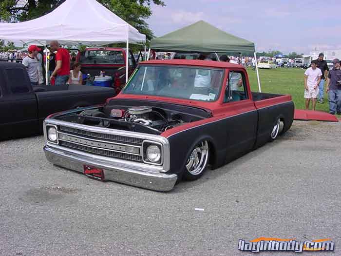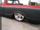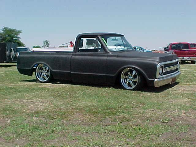 Bagged, fast valves, all stainless hardline, Lifted front crossmember and bag mounts to layframe, the cab is not bodydropped, The truck lays Rockers, the frame is not cut down, stock floor, lowered cab mounts, tunneld cab for trans. Back is 2-linked