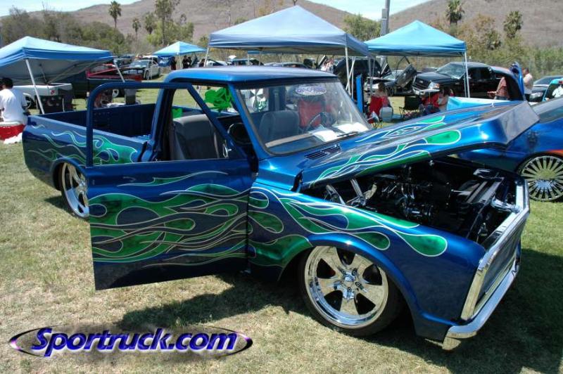 shaved molding, roof seam, door handles, gas filler, tailgate handle, marker lights painted chevy arrival metallic blue with candy green flames and skulls ghosted in in the green