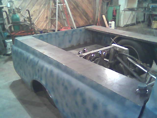 gray primer & blue guide coat w/ fenders molded to front roll pan and cowl vent. Shaved:tailgate, emblems, mirrors, cab seam, stake pockets, marker lights, moldings, antenna and drip rails. Billet grill,w/ turn signals behind grill, billet hood pins, clear tailights a chrome peep mirror at the top of the door.