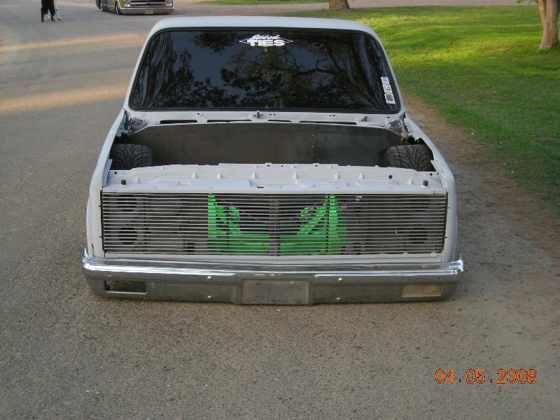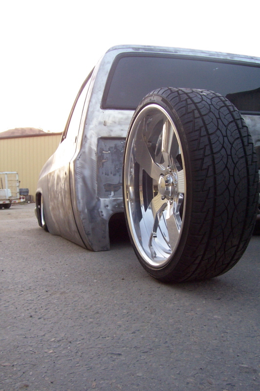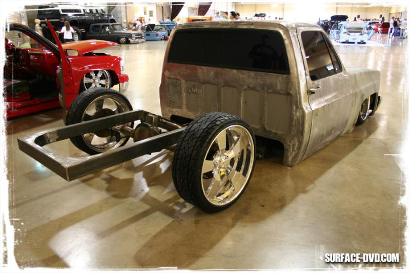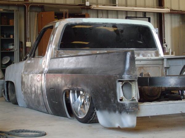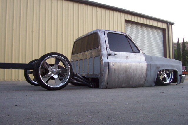 BodyDrop on 22's, shave it all up, paint frame shave firewall, sheetmetal bed, slap crate 350 in it you know just re-do her totally. Keep checking in for updates.