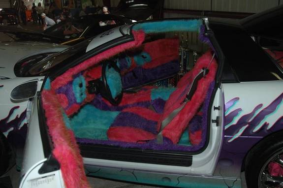 Full interior covered in Pink, Purple, and Teal Funky Fur material. Everything covered, floor, seats, headliner, trunk, doors, dash, center console, and all other panels