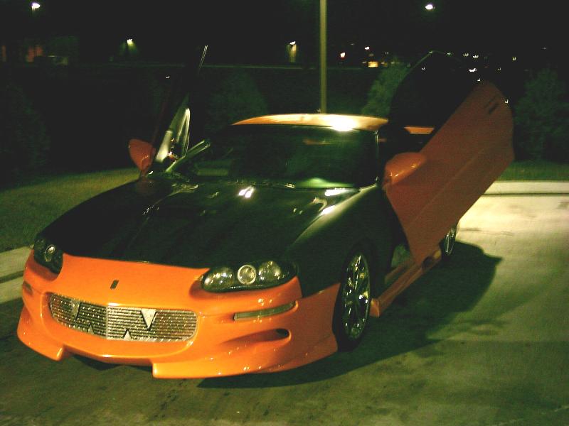 xennon front clip, vizage sides and rear shaved body line and antenna, carbonfiber ss hood , commando wing, black halo headlights, altessa tail lights, orange led light kit, custom diamond plate grille, custom billet blinker grilles, lambo doors