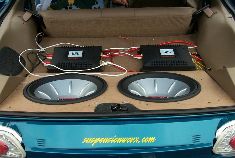 Two 15 inch MTX 6000's with two 1200 watt JBL amps. 4 pioneer 6 1/2''s. Crazy custom stuff by Jay coming in 03'