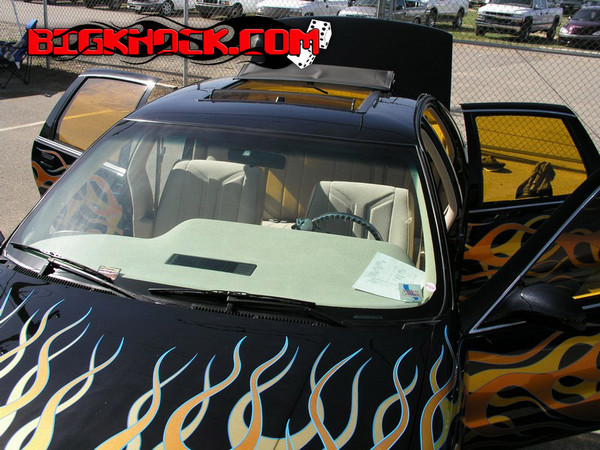 Completely custom tan tweed w/leopard flames and carpet/floormats. Orande tinted windows to match the flames.