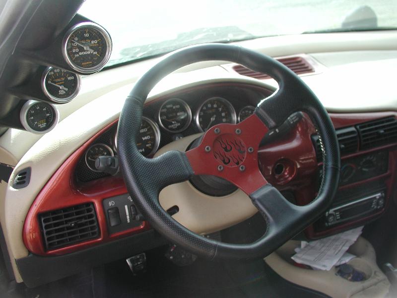 White guages, pedals, short shifter, redone in light tan (english leather look), Cobra Racing Seats, painted 8 point roll cage, Painted accents (all paint is matching orange metalic)