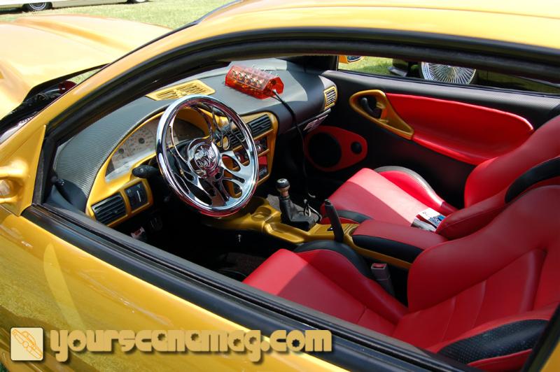 Red leather racing seats, White face gauges, black and red carbon fiber vinyl, fiberglassed dash trim and console, billet steering wheel, mirror, and ac knobs, 35% window tint