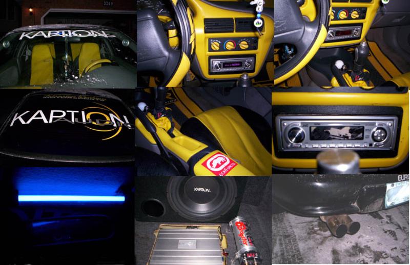 yellow racing steering wheel cover, yellow floor mats , yellow ractive racing pedals , yellow simulated leather racing seat covers front seats & back – yellow racing shoulder pads – custom yellow dash & center console yellow & yellow racing shifter- 2 StreetGlow 15” neon blue lights in back side windows – 2 6” blue strobes in top front window – Neon blue light around face plate – 15” neon plasma light in rear window – 10” black light near rear view mirror