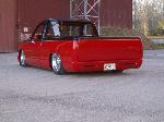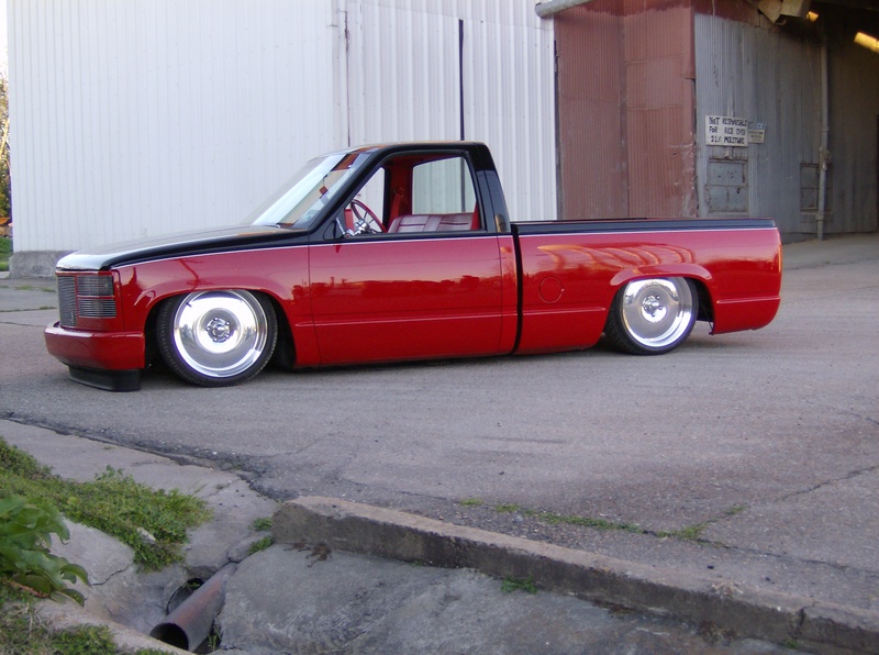GMC full phantom,smoothe bumper,shaved tailgate,shaved doors, shaved antenna, shaved stake pockests, caddy lights in roll pan, two tone-Mercedes Black,torch red mixed around,shaved taillights, Front and back wheel tubs...
