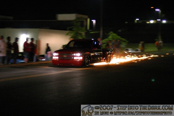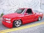 Stepside bed with Shaved rear steps and molded in rollpan from Superior Customs, Shaved door handles, Shaved taillights with LED lights in the tailgate, Shaved and relocated tailgate handle, smooth wipper cowl, custom tinted rear window with tinted flames and bowtie, tinted flames on driver and passenger windows, 30% tint on windshield, Street Scene grill inserts, SS valance w/insert and APC foglights, billet bowtie, billet antena, billet wiper covers, clear parking and corner lights, hyperwhite headlights, Goodmark cowl hood, M3 mirrors w/turn signals, Checkmate fiberglass bedcover w/carpet bedliner, billet bowtie third brake light cover, personal license plate, Street Glow neon lights underneath.
