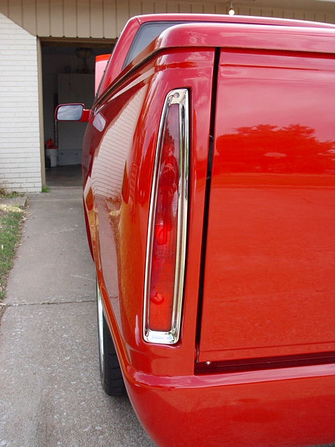 97 sedan DeVille Caddy tail lights, molded roll-pan, shaved handles, antenna, tailgate handle. 199 Cadillac Escalade front clip, chrome tow hooks, Pro Designs custom grill, snug-lid, diamond plate bed floor