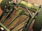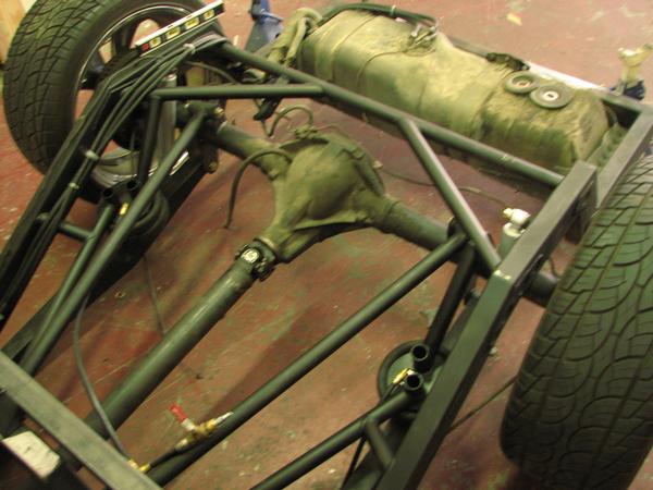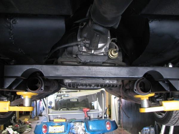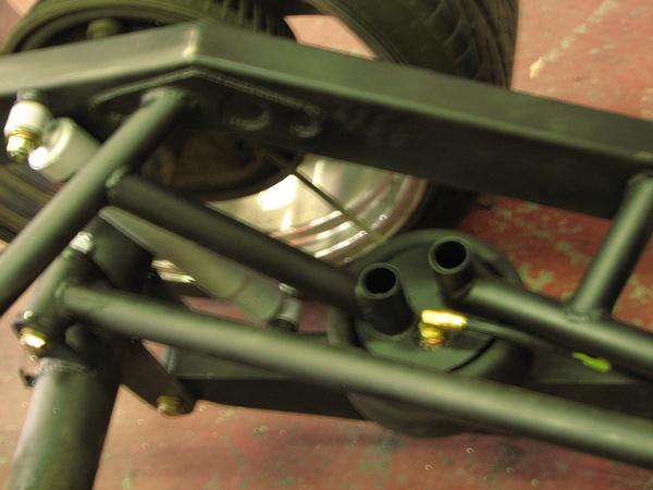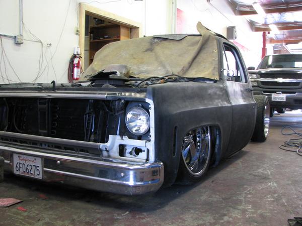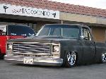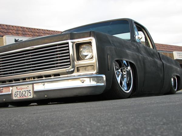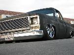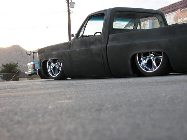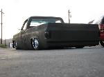 stock floored on 22s custom 3/4 frame, laying on stock control arms with drop spindles, contitech bags in front air lift dominators in the rear. custom tigged and built lower link bars. raised bed floor.