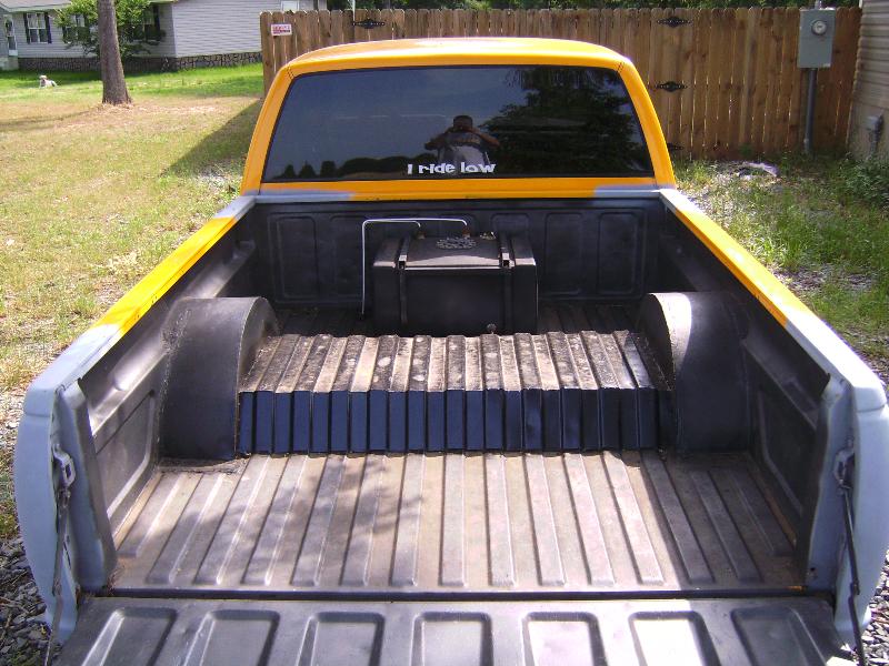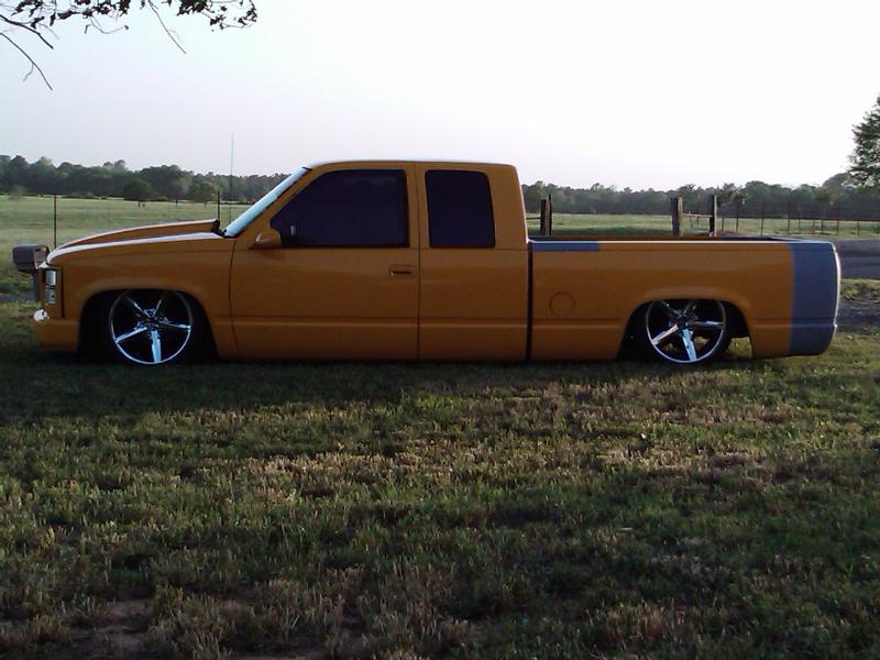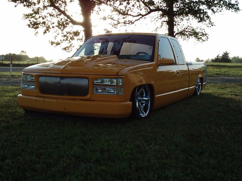 ppg chrome yellow with custom rock chips, ws6 hood, cat eye grille with speed grille insert, all clear lights up front, smoothie bumper, shaved tailights,tailgate, and rollpan with 10" leds