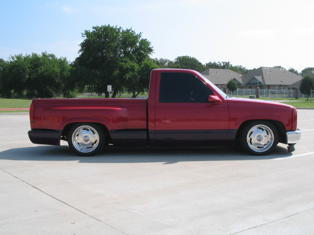 some primer spots now because some bitches like to do hit and runs and alcohol related incidents. oh well, that shit will buff out...paint: red pearl with purple and black marble bottom. shaved door handles, side markers, antenna,wiper cowl, tailgate,stake holes, molded rollpan, 98 gmc grill with Trenz billet, stylin concepts tear drop bumper, street scene sport mirrors, colonels bed cover, trenz billet license plate frame.