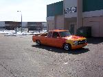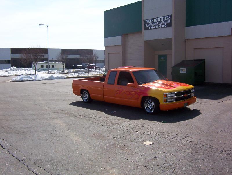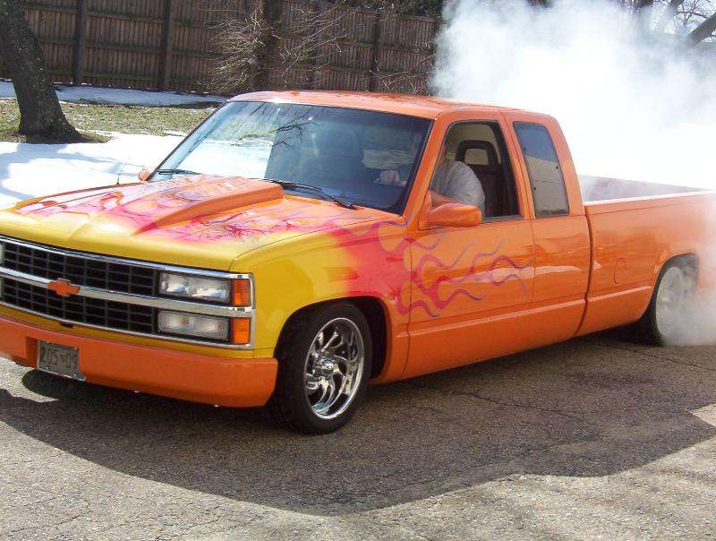Clean and Shaved. Lowered 5/7". PPG Tangelo Orange with Custom Flames outlined in PPG Royal Blue.