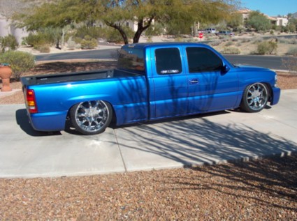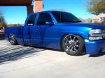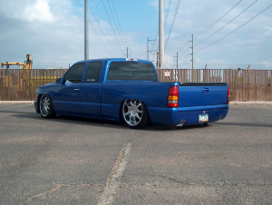 Airide Suspension all the way around 10 switch box with a 9 gallon tank and also 2 4.5HP compressors fillin em up. All customization and fabrication done by Drew Brothers Customs w/ Trevco Desgin