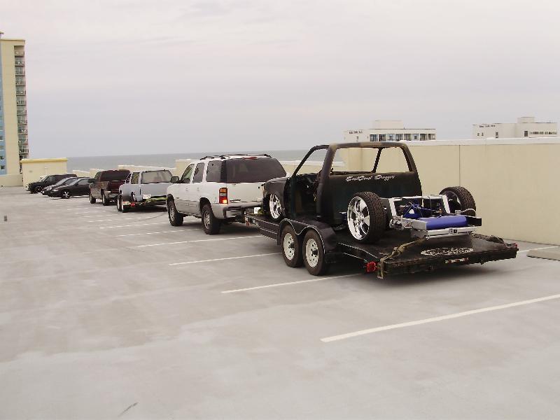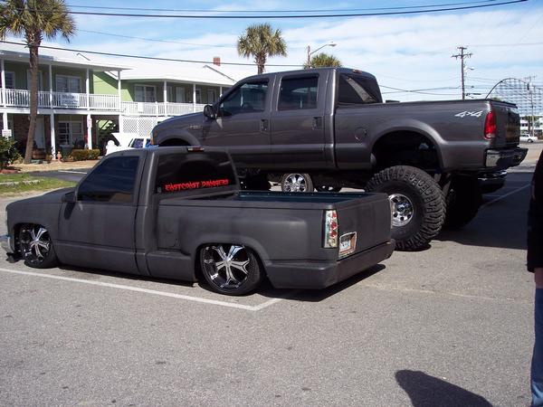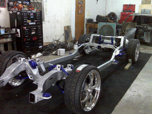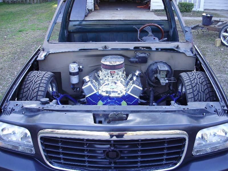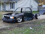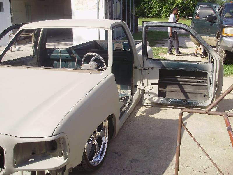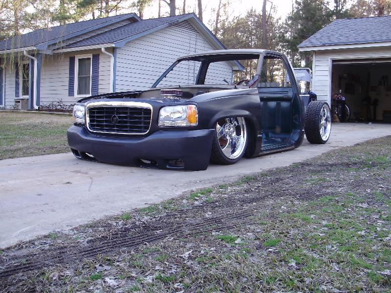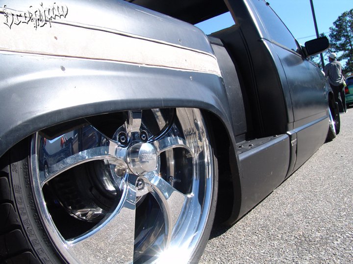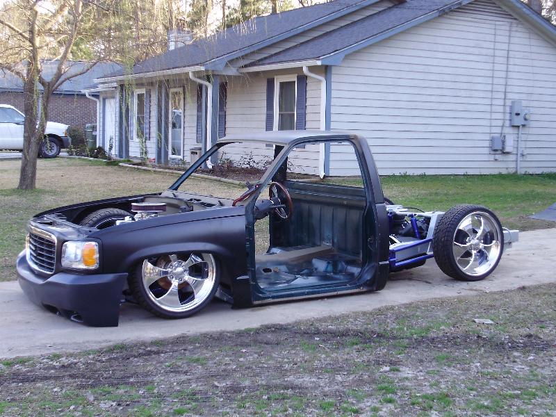 As of nov 08 the truck is setten at blockerboyscustoms in sc body is off the frame new frame with all new airride from suicidedoors.com added a wattslink airridetech control arms frame is being painted and supension parts powdercoated gona bolt up a new set of billet bonspeed 22s caddy clip is ready to go new paint with tribals new glass rino line the bed notch cover airbrushed dont know with what yet 8 6inch spikes to hold notch cover down some billet should be hitten up shows by first of next year when i get back from iraq will try and post some pics soon if you know where a good place to have the inside of the truck done around sc let me know