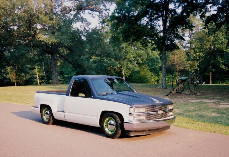 indigo blue, shaved tailgate handle, shaved stake holes, smoothed roll pan, apc mirrors, '94-98 phantom grille conversion, smooth bumper w/ frenched license, custom air dam, diamond corner lenses, steel cowl hood, running boards, french taillight covers