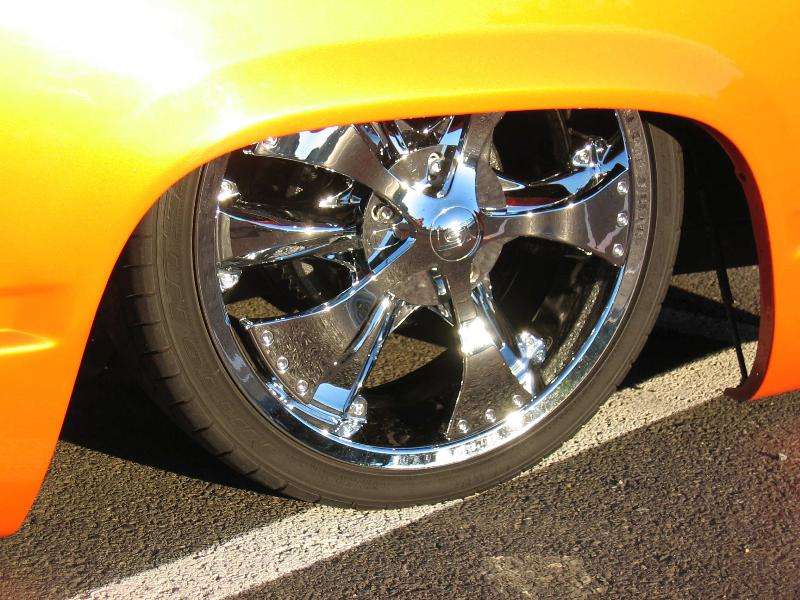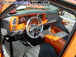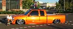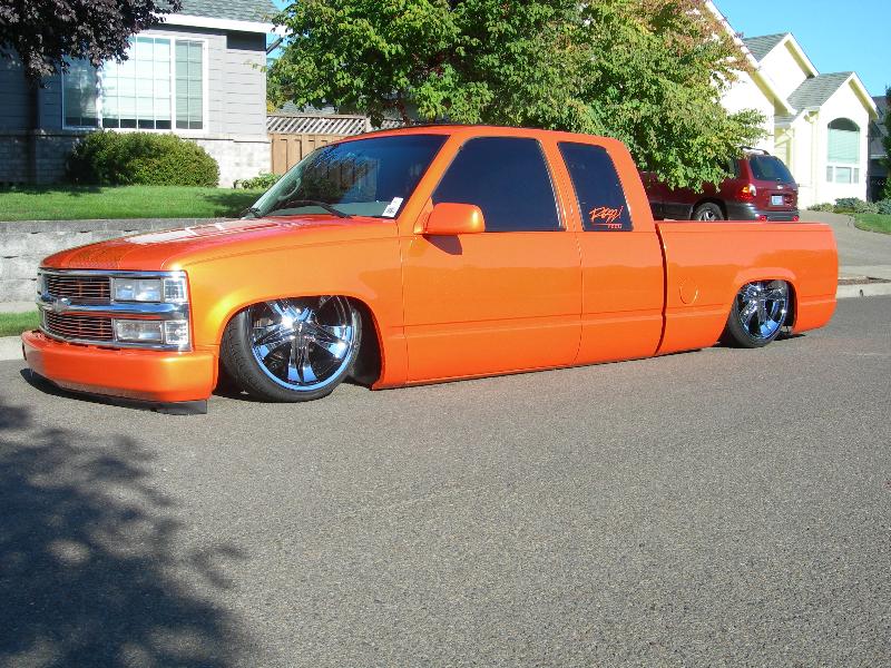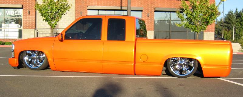 Shaved Everything, Sikkens Lamborghini Orange Pearl, Custom Graphics on the hood, LED Tail lights in the roll pan, French License Plate, Rag Top.