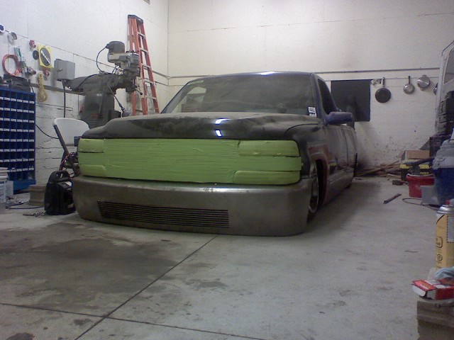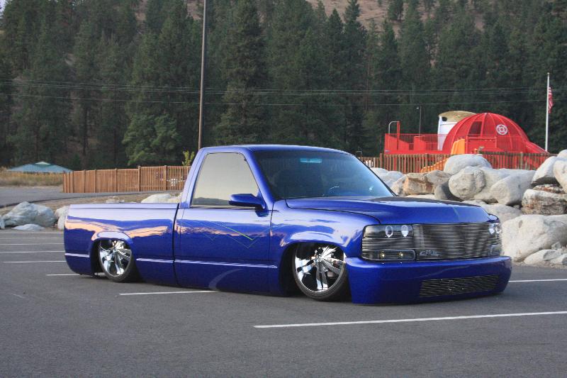 fully shaved, including tail gate, 88-93 Caddy tails, sheetmetal bed with hump, two tanks and a 15 gal fuel cell, 2&3/4" stock floor body drop, cowl hood, more bolt on shit,